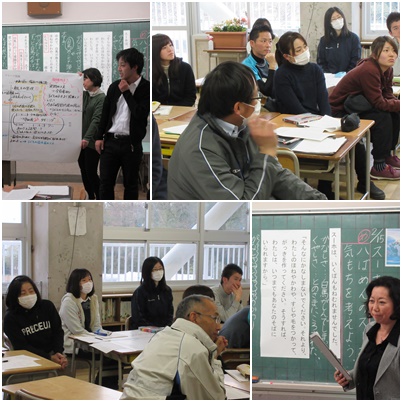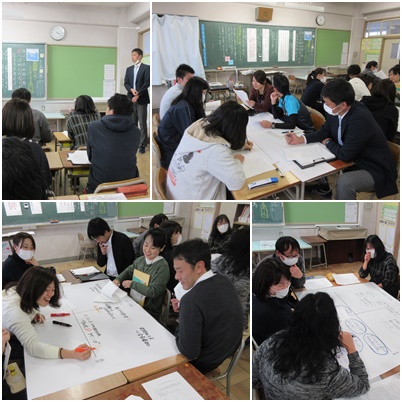 2月15日の授業後、2年2組の国語授業をもとに授業研究協議会を行いました。会場は2年2組の教室です。「学ぶティーチャーズ」たちが、国語授業を参観して湧きあがってきた「やる気」をもって集まってきました。