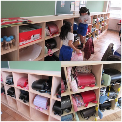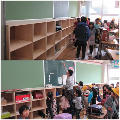 1年生と2年生の教室に新しいロッカーが設置されました。写真は、1年生の子どもたちが登校してきた直後の様子です。ぴかぴかのロッカーにランドセルを収納しています。