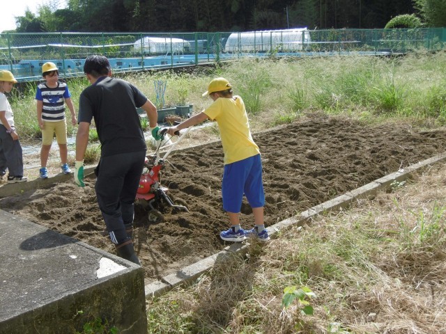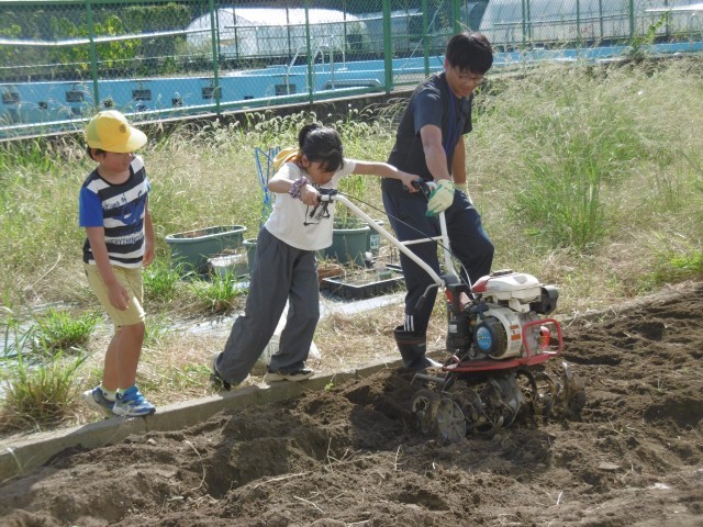 子どもが大人と一緒に耕運機を押してもなかなか前に進めません。全身で重さを感じ、土の中を進む難しさを知って畑づくりの大変さ感じました。