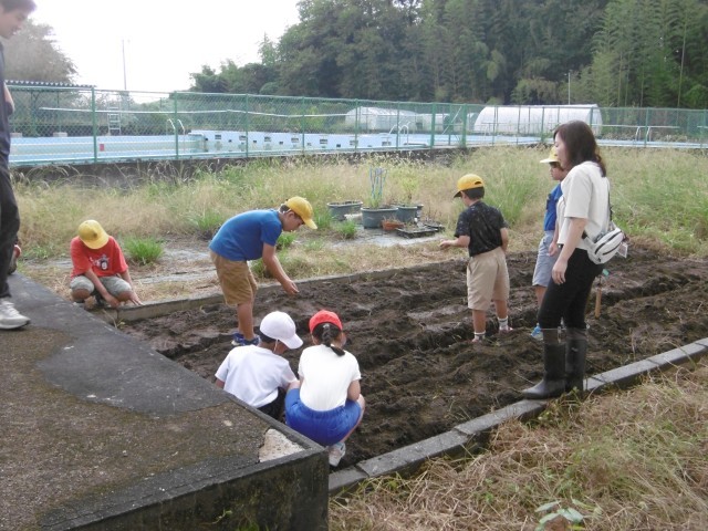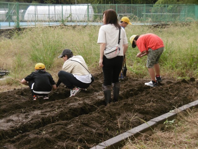 畑に大根の種をまきました。小さな種を一人10粒ずつ手に取り、穴に巻いて土をかぶせました。