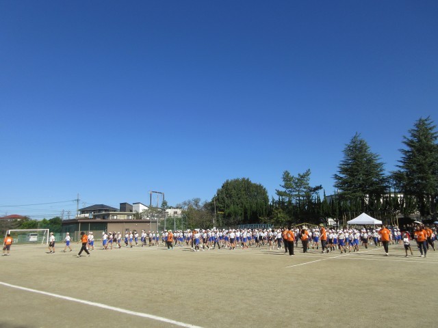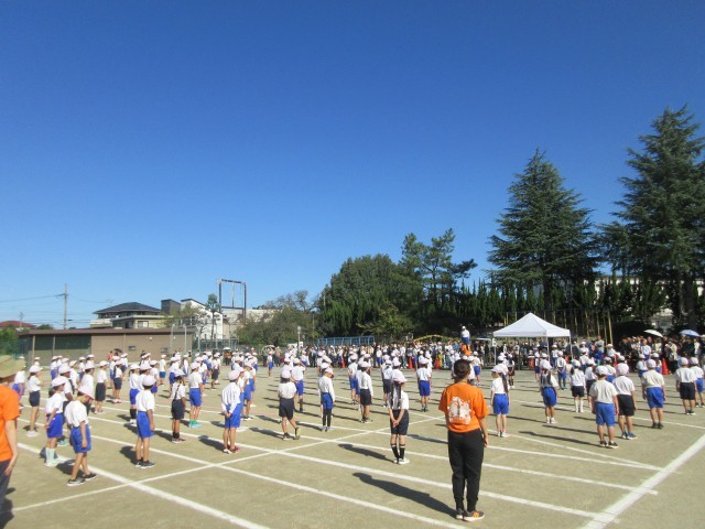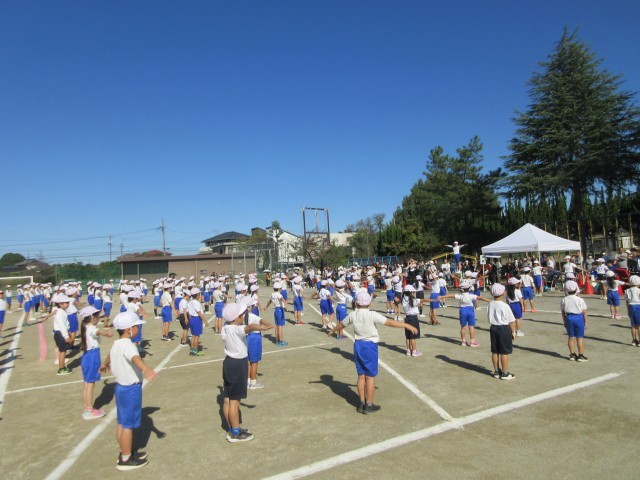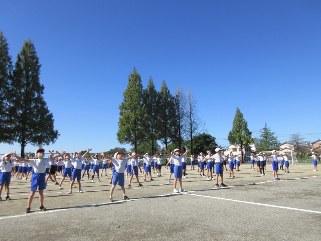 とても気持ちのいい青空の下、スポーツフェスティバルがスタートしました。ラジオ体操の様子です。