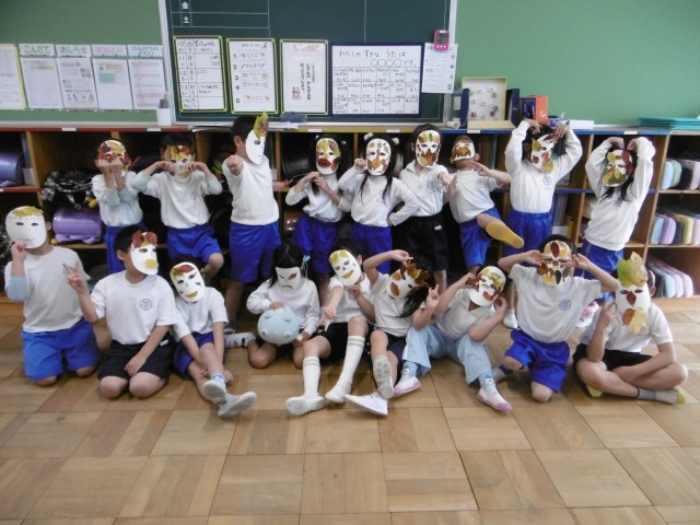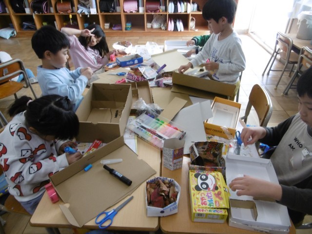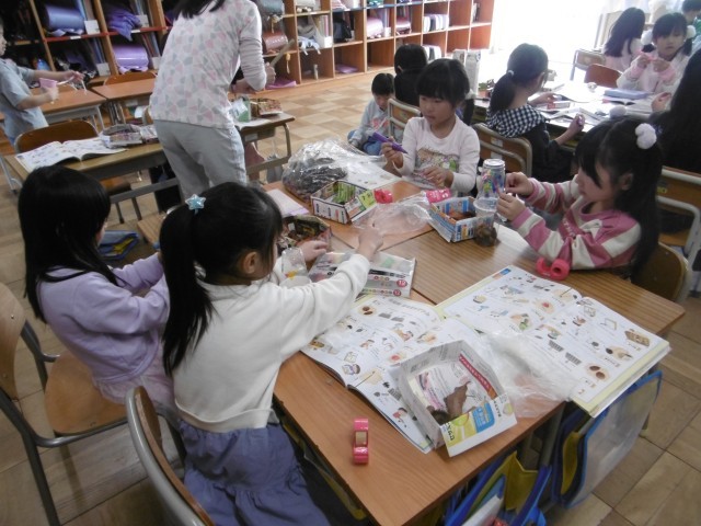 落ち葉のお面、どんぐりごま、マラカス、けん玉、めいろ、やじろべえなど、みんなで楽しくつくることができました。