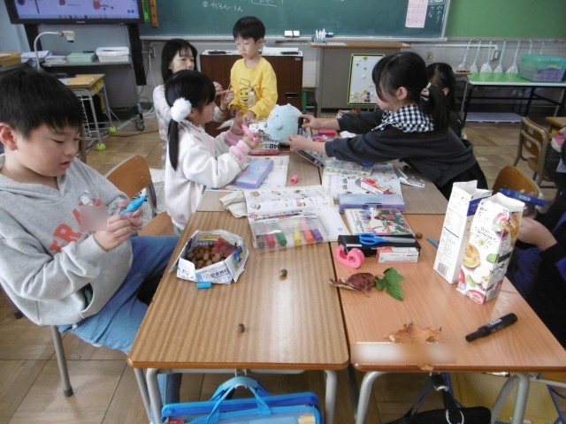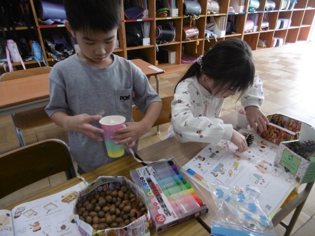 公園や運動場で見つけてこつこつためておいた、落ち葉やどんぐり・松ぼっくりを使って、おもちゃを作りました。