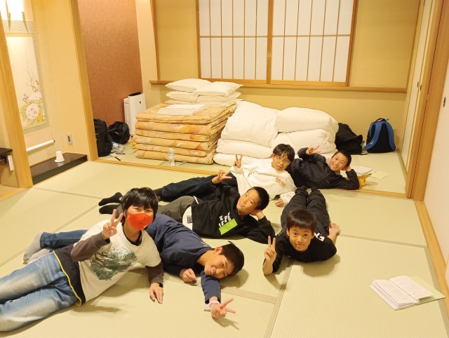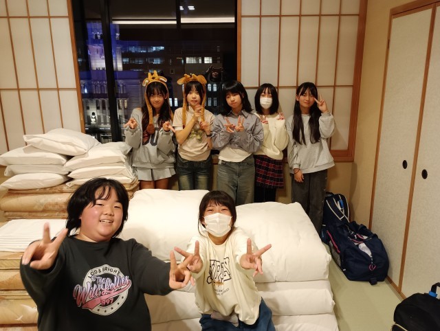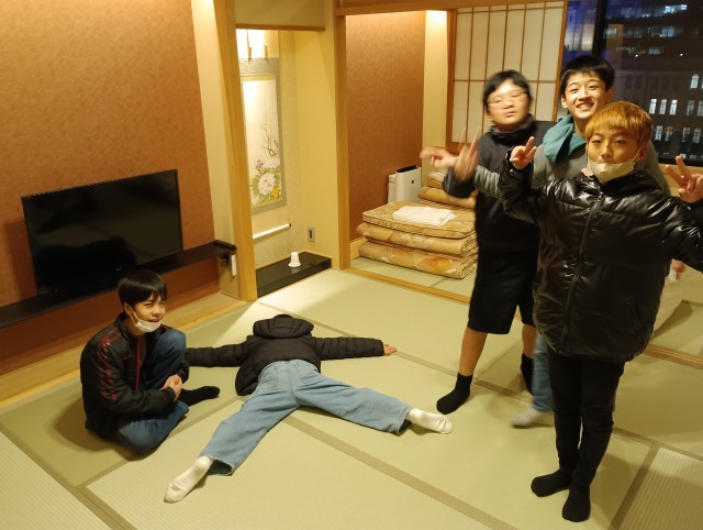 ホテルでの部屋の様子です。友達と談笑やカードゲームをしながら、ゆったりとした時間を過ごしています。また、しおりを見て行程を確認したり、部屋の整頓をしたりする姿も見られました。