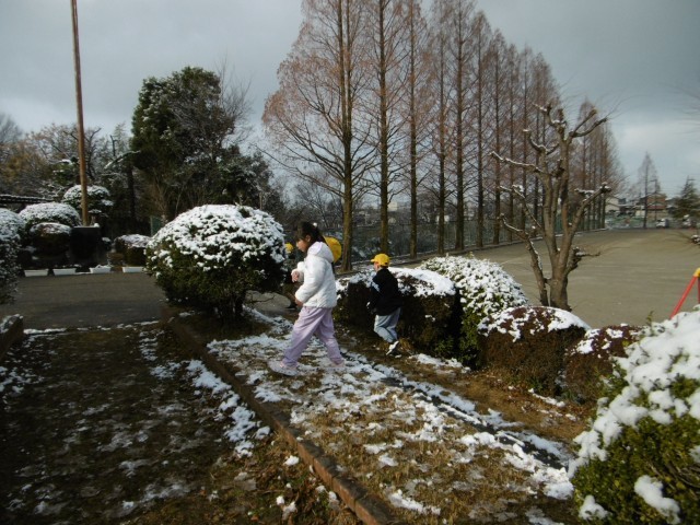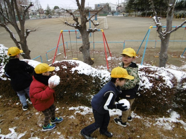 今日は雪がつもったので、教室を出て運動場に遊びに行きました。