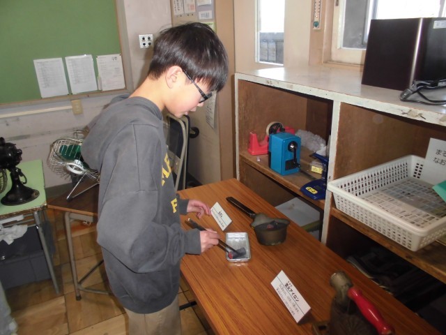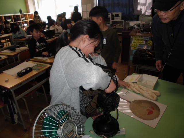 先日、出前授業を行いました。今回の出前授業は、社会「市の様子と人々のくらしのうつりかわり」の学びを深めるための学習です。昔の人が暮らした「四つ建て民家」の建物の工夫や当時の暮らしの様子をお聞きしました。また、昔の道具を実際に見せていただきました。蓄音機の音も実際に聞くことができ、子どもたちは今のCDなどとの音の違いを楽しみました。その他にも、実際に触れることができた道具もたくさんあり、当時の暮らしの様子を想像しながら、興味をもって学ぶことができました。