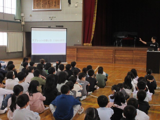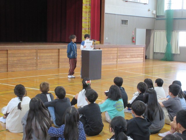 15日(月)に体育館で朝会を行いました。はじめに4年生以上の学級委員の認証を行いました。学級や学校の中心となって活躍してくれることを期待しています。その後、タブレット端末の使い方についての話や委員会からのお知らせがありました。
