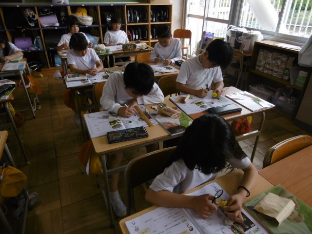 理科では、校庭の植物を観察しました。ルーペを使って茎のふさふさした部分を見つけたり、定規で大きさを測ったりと、発見したことをノートに記録することができました。