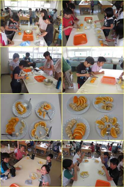 家庭科「手順を考えて安全に調理しよう」の学習で、包丁の安全な使い方と果物の切り方を学習しました。
