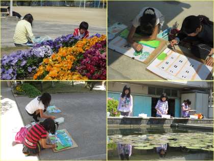 図工の学習で、感じたことや伝えたいことを基に風景を切り取ったり、表し方を構想したりして絵に表しました。