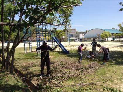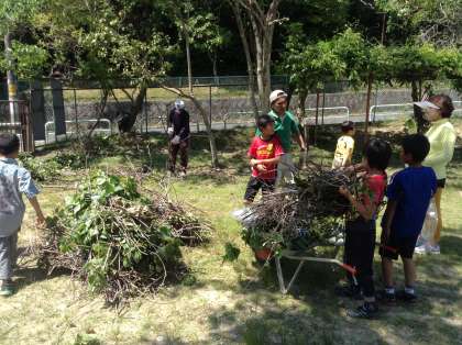 イーグルスの長谷川部長さんが,ときどき学校にいらっしゃって,木の剪定や側溝のそうじなどをしてくださいます。先週も,東門の周りの草刈りや,北門に絡みついている藤のツルを切ってくださいました。作業が終わる頃,ちょうど掃除の時間から昼放課だったので,子どもたちにも手伝ってもらい,切り終えた枝などを片付けてもらいました。