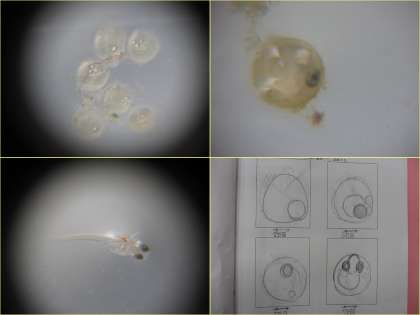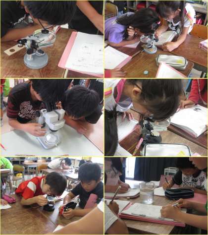 理科「魚のたんじょう」の学習で、メダカのたまごの観察を行いました。解剖顕微鏡を使い、成長の目立った変化をとらえて記録することができました。
