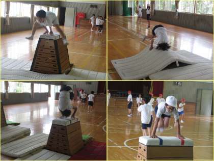 体育の学習で跳び箱運動に取り組んでいます。もう少しでできそうな技やもっと上手になりたい技を考え、自分の目標を決めて頑張っています。