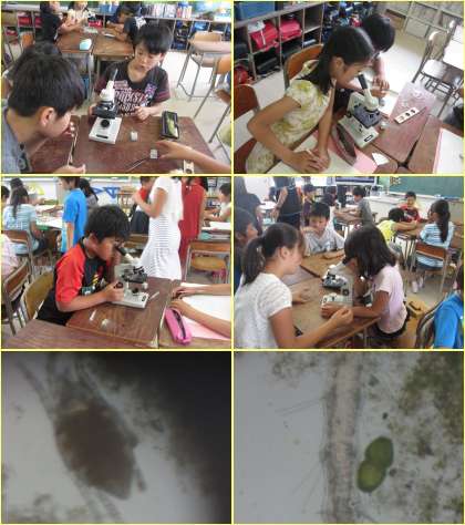 理科「魚は何を食べているのだろうか」の学習で、顕微鏡を使って、水槽や池の水の中の生き物を調べました。