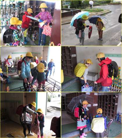 4月8日(水)は、1年生の子どもたちにとっては、初めての雨の登校になりました。昇降口では、いっしょに登校したお迎え当番の子どもたちが、1年生にかさの片づけ方をやさしく教えてあげていました。