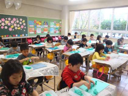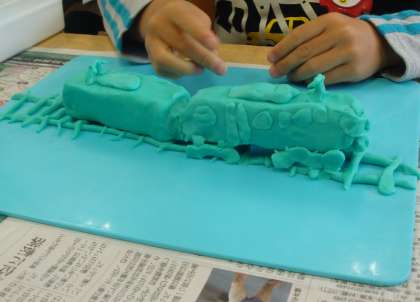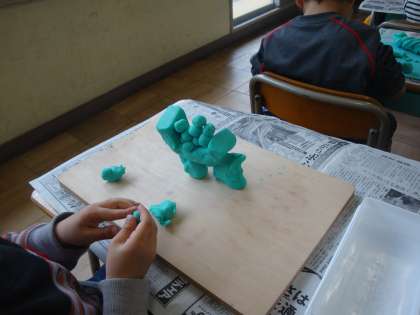 図工の授業で粘土を使って好きなものを作りました。電車やうさぎ、家族で食事の場面など様々なものができました。