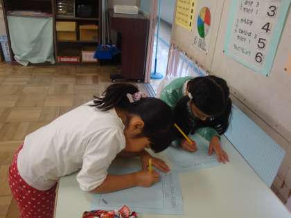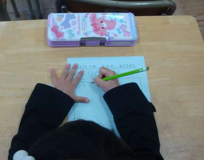 書写のじかんに教室の中の文字探しをしました。いろいろな掲示物や二年生が描いてくれた作品からも見つけることができました。鉛筆の持ち方や姿勢についても気をつけることができました。