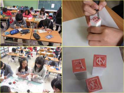 書写の作品に押すはんこ作りを行いました。書写の作品に押すと、作品が書道家の作品のように見えるかな。