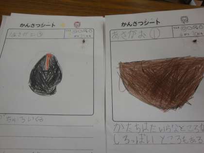 あさがおの種の観察をしました。思ったより丸くない、茶色も部分もあるなどの意見もでました。休み明けには、種まきをしたいですね。