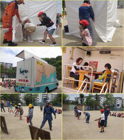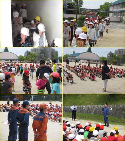 5月7日(木)、「理科室より火災が発生し延焼の恐れあり」という想定で避難訓練を行いました。各教室からの避難経路と避難時の注意事項を学習することができました。避難訓練の後、1年生〜3年生は煙道体験、4年生・5年生はグラッキーによる地震体験、6年生は消火器による消火訓練を行いました。
