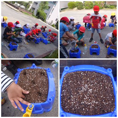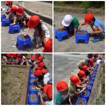 生活科の時間に、あさがおの種をまきました。どんな色の花が咲くのか楽しみですね。