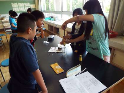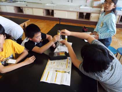 理科の学習で空気の変化を調べました。気体検知管を使って、火が燃える前と燃えた後の酸素と二酸化炭素の割合の変化を調べることができました。