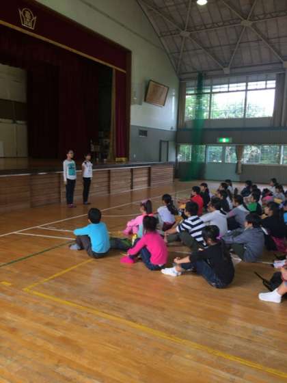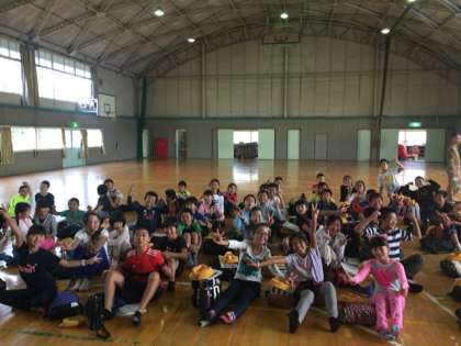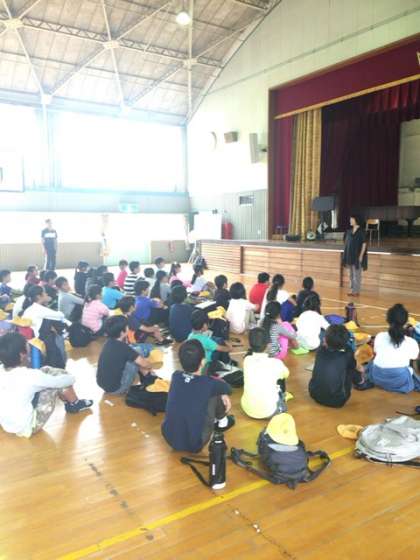 54名全員元気に揃いました。実行委員の進行で出発式が始まりました。校長先生から野外活動の心構えを教えていただきました。