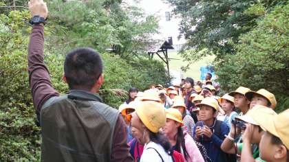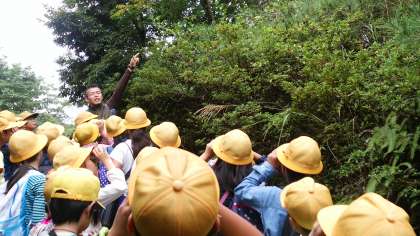 クモの巣やキノコのお話も面白く、双眼鏡も大活躍です。双眼鏡の練習をしてから出発しましたが、反対からのぞいている子も多く、小さく見えてますよ(笑)