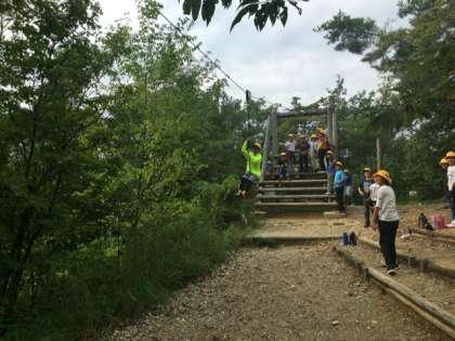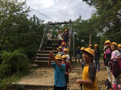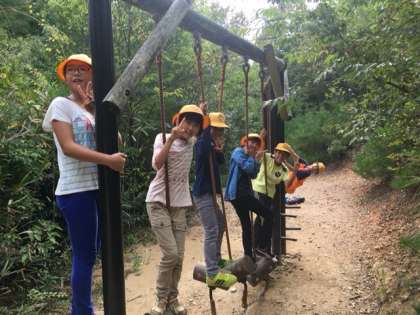 先生たちが森のビンゴの集計中、子どもたちはトリムを満喫しています。ターザンロープが大人気!成功するたびに拍手がおきています。