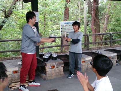 子供たちが自分の力で起こした火は、かまどで食事をつくり、さらには、夜のファイヤーの火へと受け継がれます。その受け継ぐ儀式がサプライズで行われました。(消えちゃったらどうしよう…チャッカマン登場?)