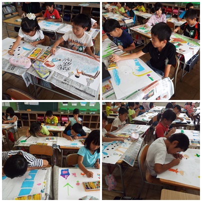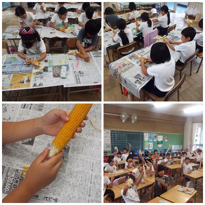 2年生は図工で読書感想画の学習を行いました。前回描いた下がきに、クレパスや絵の具を使って色を付けていきました。思い浮かべた場面を画用紙に表すことができました。また生活科では、学年畑で育てていたトウモロコシをポップコーンにするために、実を一つずつ取っていきました。始めは硬くて苦戦していましたが、途中からコツを掴んできれいに実を取ることができました。