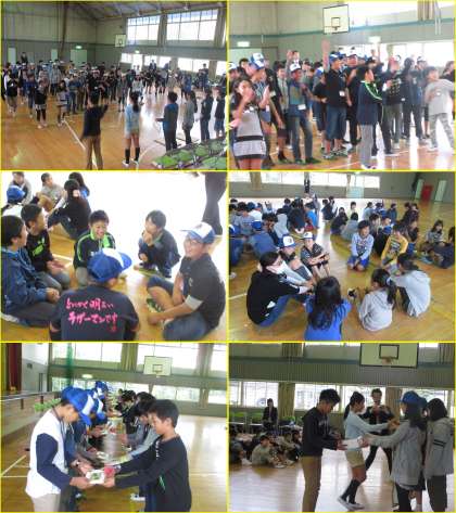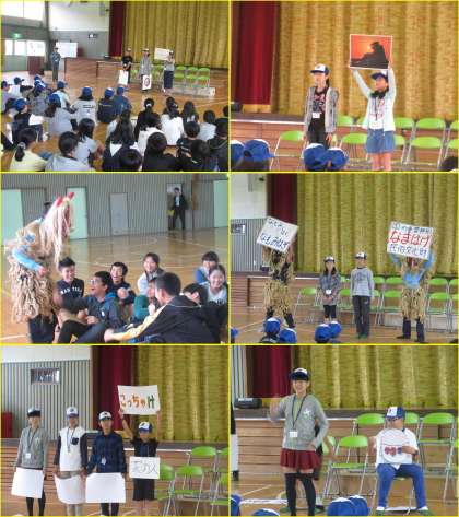 10月17日(月)、春日井市を訪問している男鹿市の5・6年生をお招きして、交流会を行いました。男鹿市のみなさんから、男鹿市の自然、食べ物、行事、方言などについて教えてもらいました。なまはげについての説明の中で、実際になまはげの衣装を着て実演してくれました。とっても迫力がありました。その後、ゲームを通して親睦を深めました。最後に高森台小学校から写真立てを贈り、男鹿市のみなさんからなまはげの置物と暖簾をいただきました。短い時間でしたが、楽しいひとときを過ごすことができました。これからも、春日井市と男鹿市の交流を続けていきましょう。