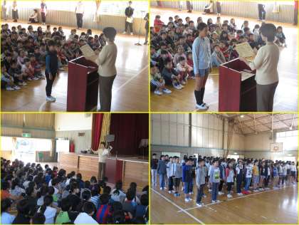 10月24日(月)の朝会では、校長先生より、5年生が国語の授業で書いた「学校をよりよくするための提案文」の中から「スーパースマイル」を紹介してもらいました。どんな時でも、みんなが笑顔を意識し、明るい学校にできるといいですね。また、赤い羽根作品クールの表彰がありました。