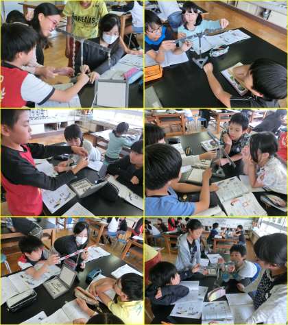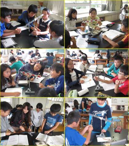実験用てこを使い、てこを傾ける働きが左右で等しくなるのはどんなときか調べ、てこが水平につり合うときのきまりを考えました。