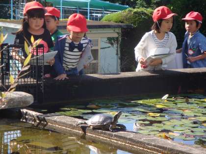 国語の授業で、周りの人に学校の亀について知らせるために亀の観察をしました。カメックスという学級内だけの名前も付け、「目をパチパチした」「手で顔を洗ったよ」「ほっぺみたいに赤い模様がある」などよく観察することができました。