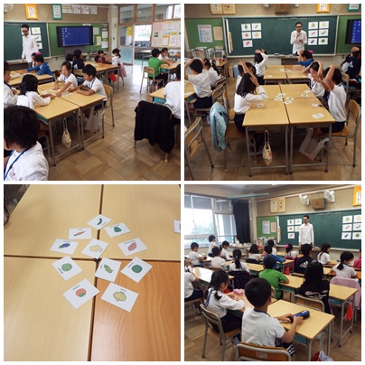野菜カードを使って、かるたを行いました。今日はナスやキャベツ、きゅうりやピーマンを英語で言うとどんな言い方になるかを学びました。