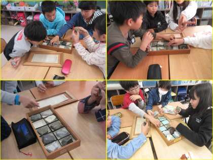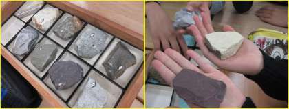 理科「大地のつくり」の学習で、色々な種類の岩石の観察をしました。重さを比べたり、手ざわりや表面の様子を調べたりして、それぞれの岩石の特徴について考えることができました。