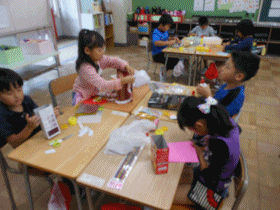 図工の授業で「はこかざるんるん」を行いました。折り紙などを使って、持ってきた箱をきれいに飾ることができました。お気に入りの箱ができましたね。