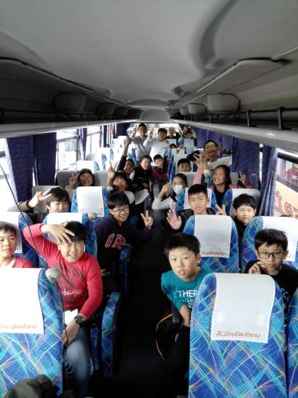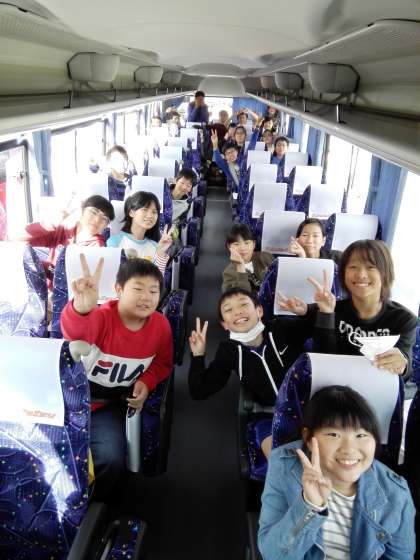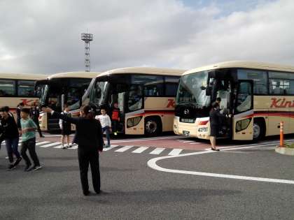 トイレ休憩です。1号車も2号車も、全員元気です。