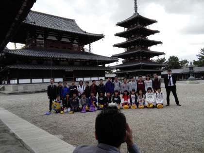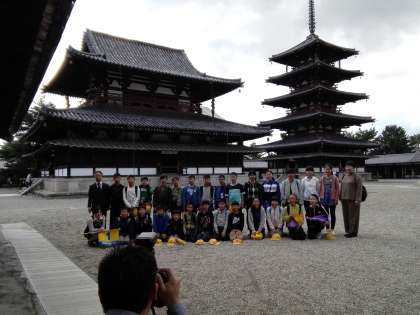 中門が修理中なので、内側で五重塔と金堂を背景にクラス写真です。
