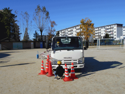 3・4年生は、自動車の死角や内輪差について教えてもらいました。ぶつからないと思っていた自転車にトラックがぶつかった時は、みんなびっくりしていました。