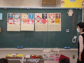 来年の干支であるねずみの「子」の字を、チョークとクレヨンを使って和紙に書きました。難しい作業でしたが、丁寧に書いていました。そして、来年の自分の目標を書き、ねずみのイラストを貼って、かわいく飾りました。どの子も頑張って作り上げました。
