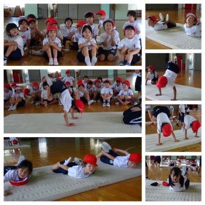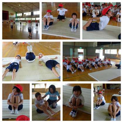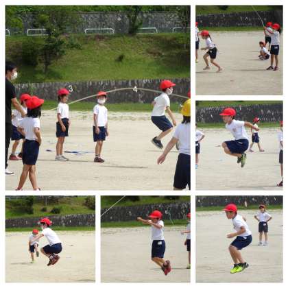 1年生は体育館でマット運動。2の1は運動場で大縄跳びの練習です。