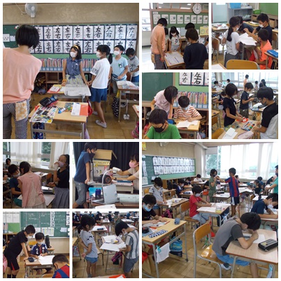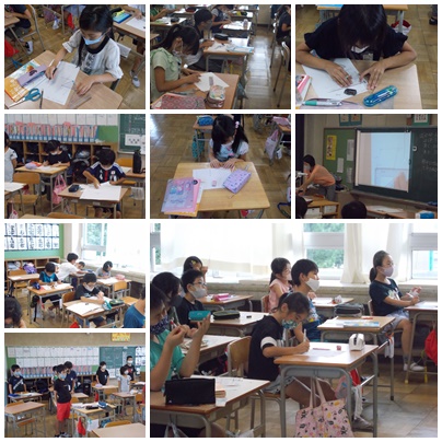 6時間目の4年生は、1・2組ともに国語の学習です。グループで話し合いながら新聞作りをしていました。どんな新聞が完成するか楽しみです。算数では、三角定規を使って平行四辺形をかいています。とても難しいですが、がんばってます!