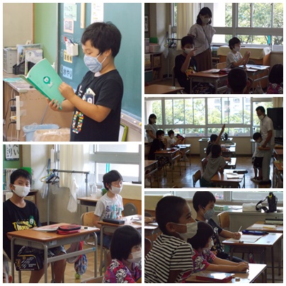 5年生は図工と総合の時間です。総合ではバケツ稲のようすについて観察していました。5・6組では「好きなもの」について作文を書き、発表していました。話す・聞く姿勢がすばらしい♪