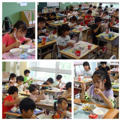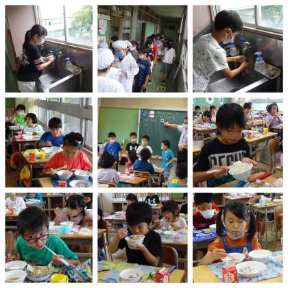 給食の時間です。消毒・手洗い・配膳、先生が言わなくても自分たちでできるようになりました。