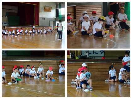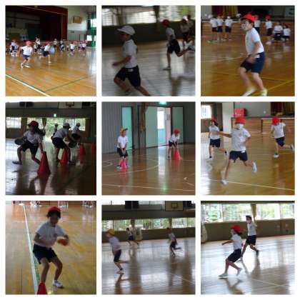 体育です。いろいろなリレーを楽しんでいます。チームワークが大切ですね。