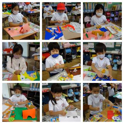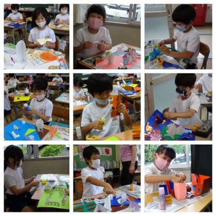図工の時間です。完成した子から名札を貼っています。 最後の仕上げに夢中です。