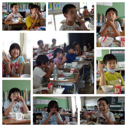 1年生の給食の様子です。今日の給食は「手巻き」です。上手にくるくる巻いて食べていました。