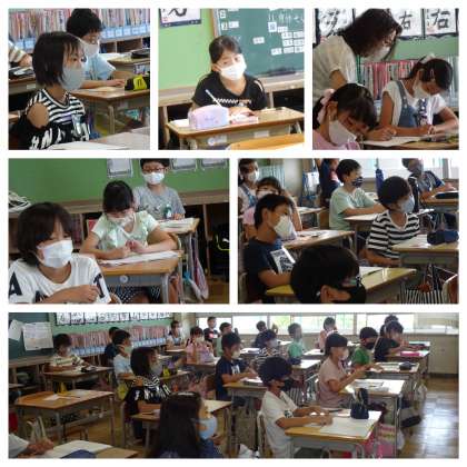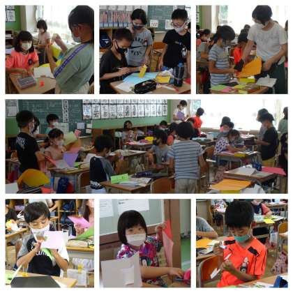 1組は図工。飛び出すカードを作っています。 2組は算数。小数です。